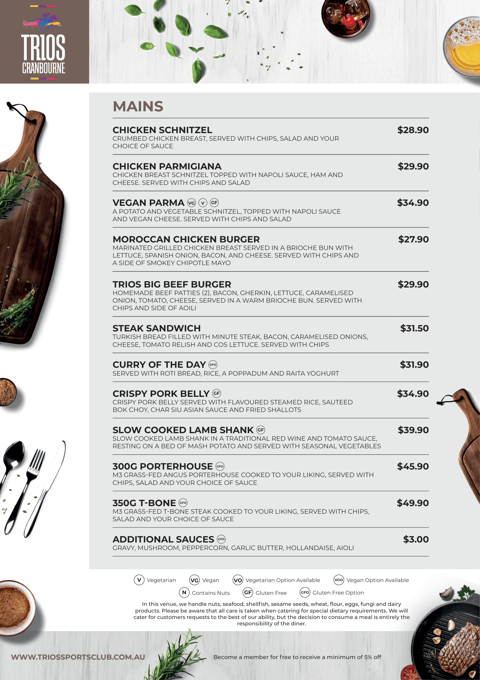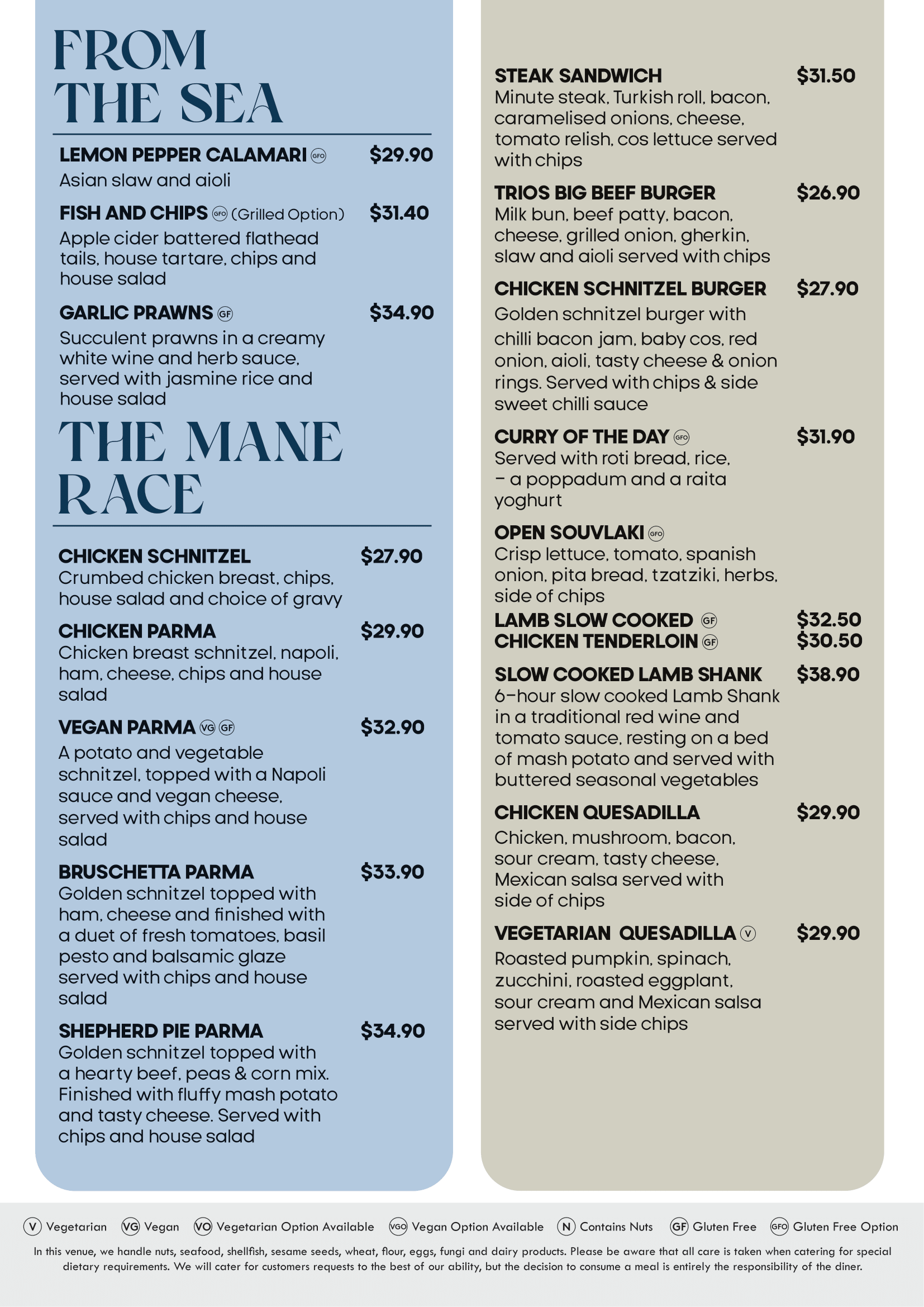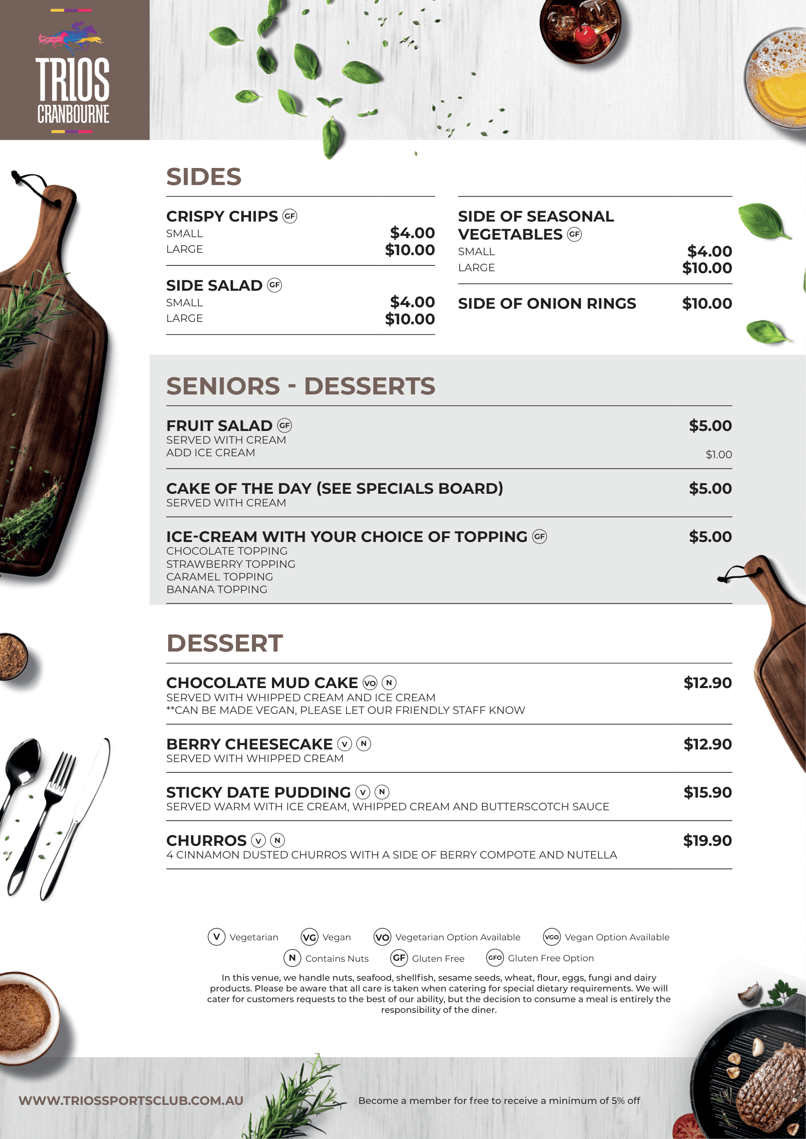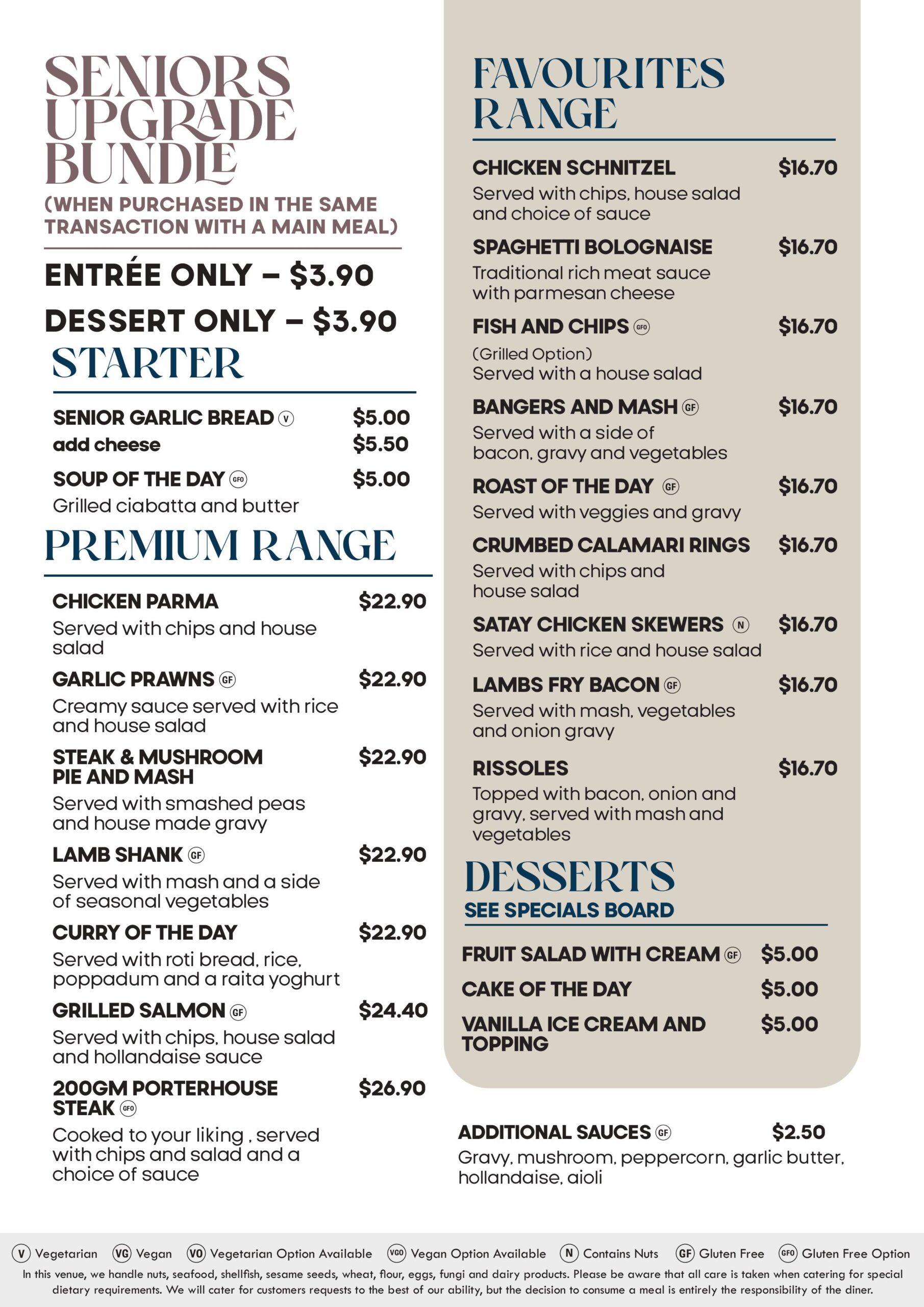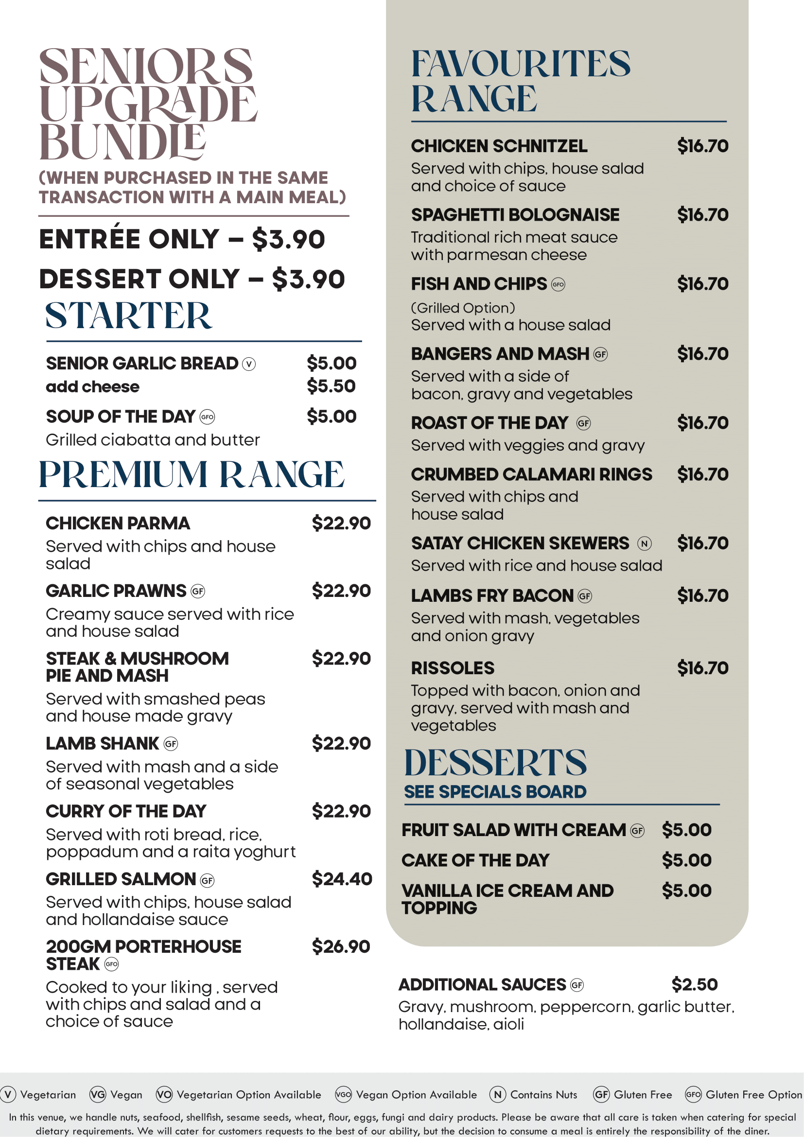 Our Seniors Menu has a great selection of meals available for both lunch and dinner 7 days a week. Choose from either our Favourites range or our Premium range. Entrée and Dessert also available.