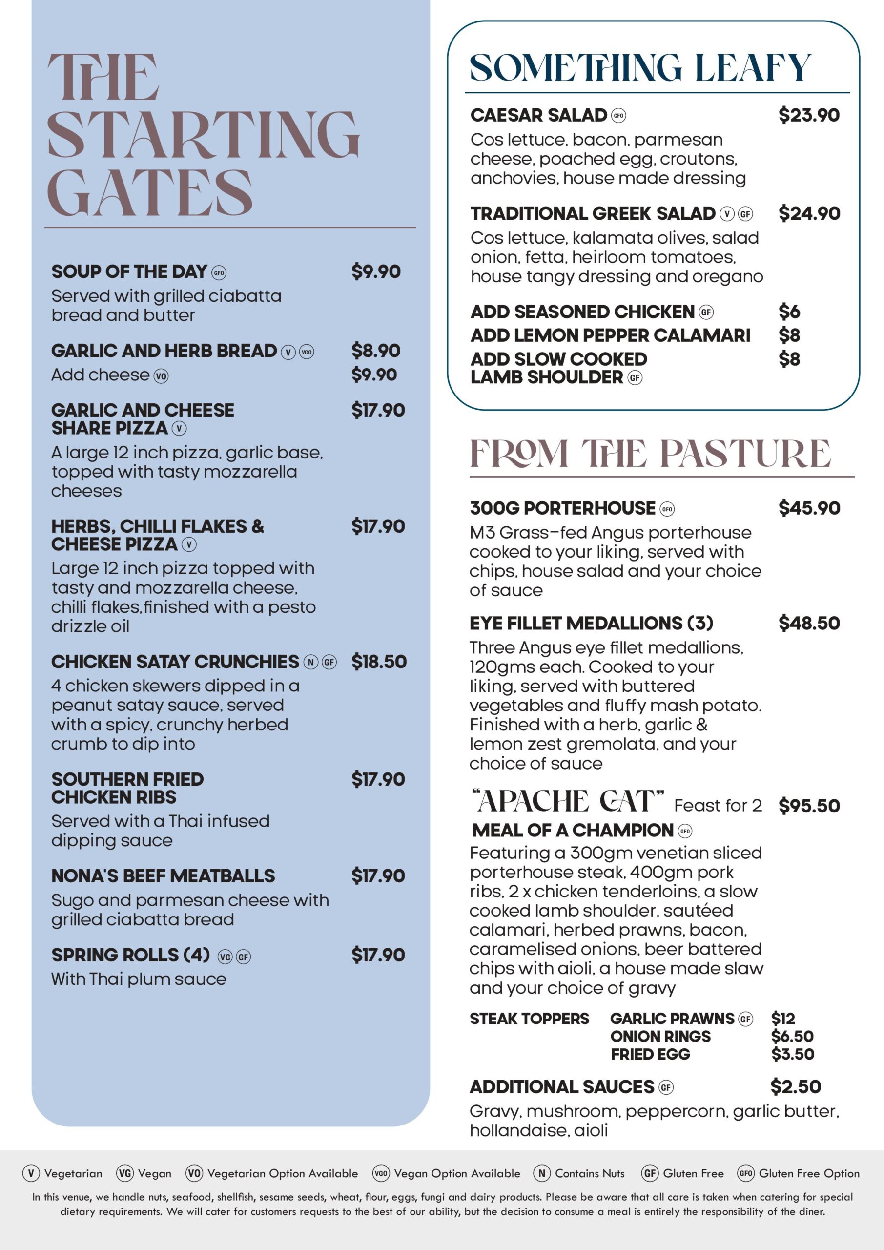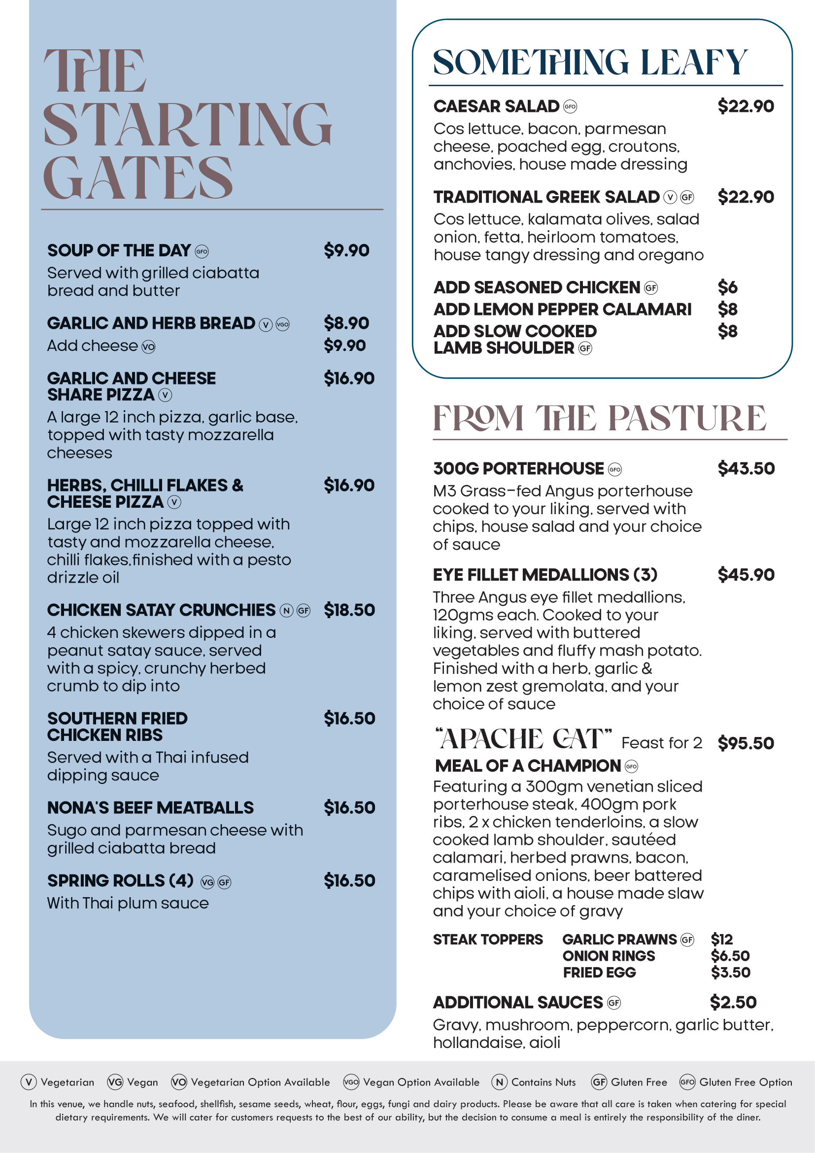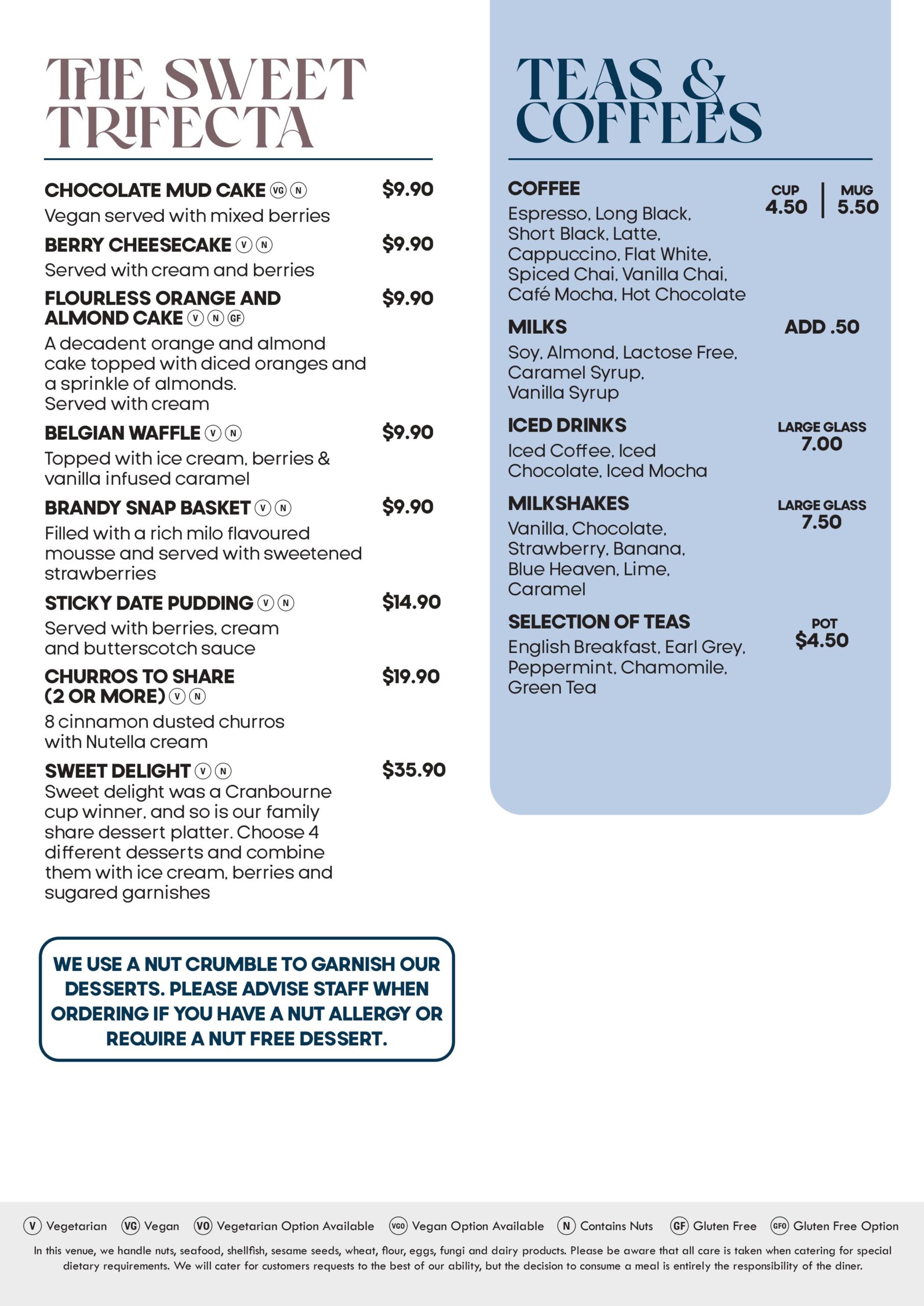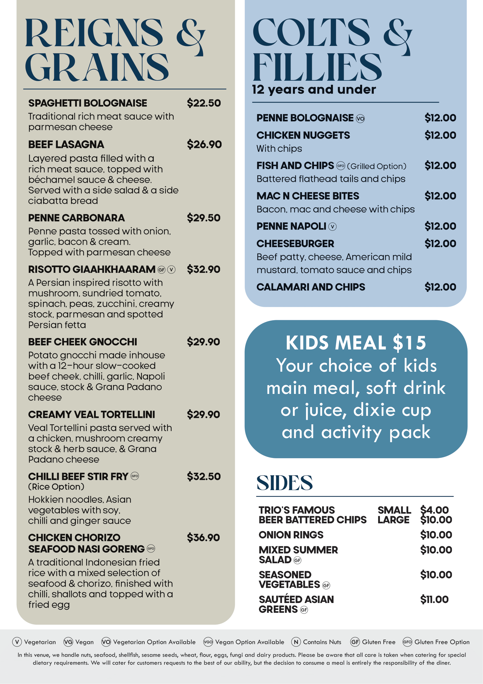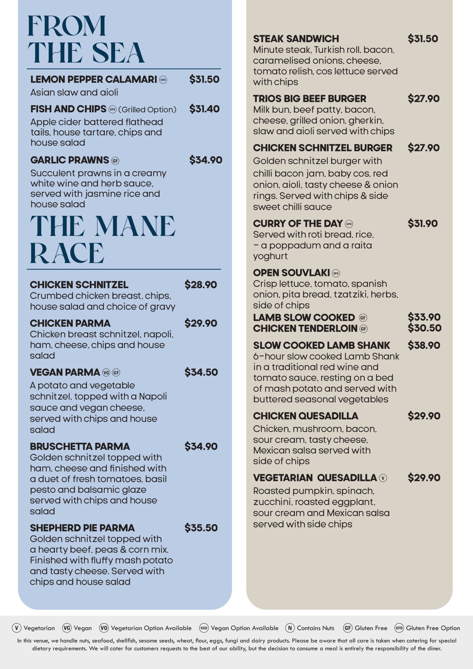Our Seniors Menu has a great selection of meals available for both lunch and dinner 7 days a week. Choose from either our Favourites range or our Premium range. Entrée and Dessert also available.